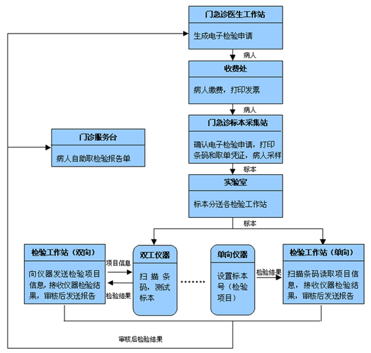 从检验申请、标本管理到检验结果的传输实现完全无纸化,不需要手写或打印的申请单跟随标本,检验申请以电子方式传递到采样窗口,支持病人用医疗卡完成缴费、采样各项活动,患者标本送达检验科后,检验技师扫描条码向电脑传递实施项目。仪器完成检验后,检验结果自动发回电脑,检验师审核确认后以电子方式发向申请医生。